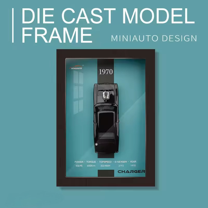 This 3D diecast frame model features the legendary Dodge Charger in a bold, vintage-inspired display. The 1:32 scale diecast car is mounted inside a premium deep frame, highlighted with classic muscle-car styling and printed performance details from the iconic 1970 era.