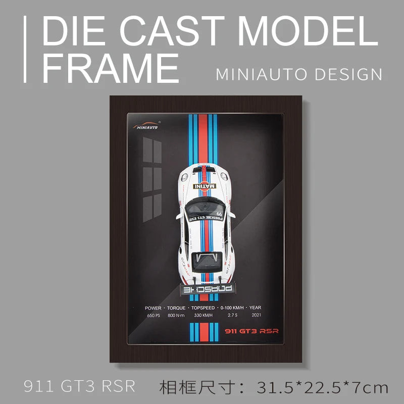 This 3D diecast frame model features the race-bred Porsche 911 GT3 RSR, designed for endurance racing and motorsport excellence. The 1:32 scale diecast car is securely mounted inside a premium deep frame, creating a bold 3D effect that highlights the iconic Porsche silhouette, racing livery, and track-focused engineering.