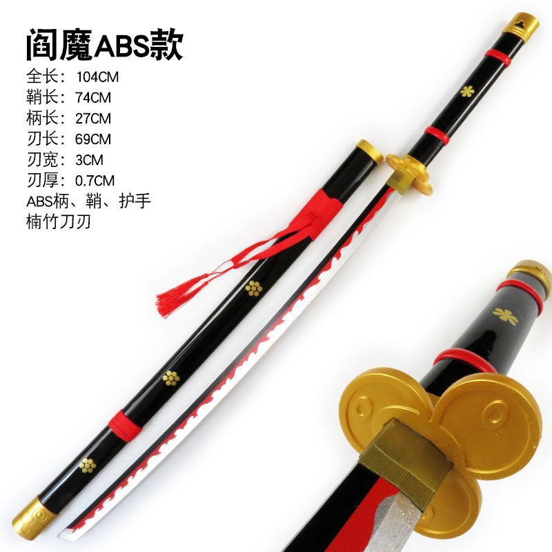 This 104cm Black Enma Katana is a premium wooden replica of Roronoa Zoro’s legendary sword Enma from One Piece. Featuring the iconic black-and-red flame blade pattern, gold fittings, and elegant black sheath with red accents, this replica captures the fierce power of the sword that once belonged to Kozuki Oden.